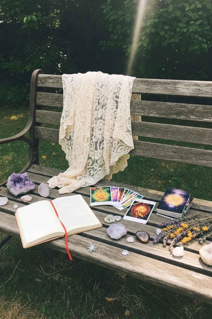 Set up a weathered wooden bench and surround it with herbs, crystals, and handwritten affirmations or spell cards. Drape a shawl or lace over one side, and place a journal or oracle cards on it to invite introspection.