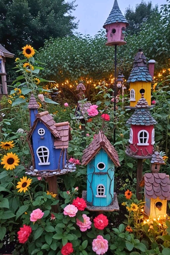 Install mismatched birdhouses on tall posts, and surround them with shade-loving plants like hostas and ferns. This setup adds vertical interest and a nostalgic woodland vibe to shaded corners.