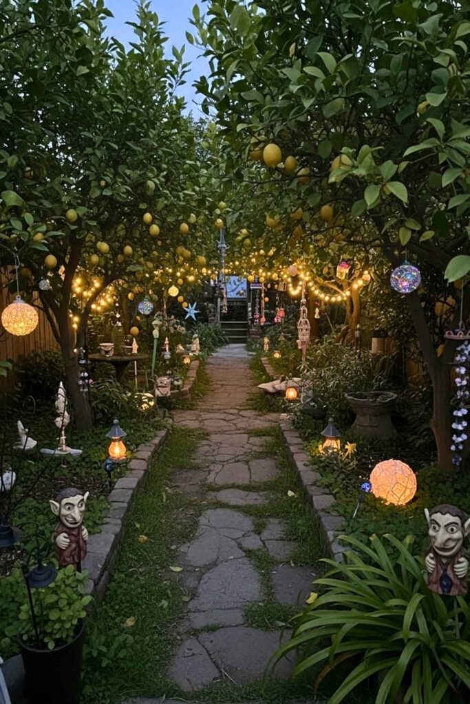 Imagine entering your garden through an arched wooden arbor draped with a lemon tree, its golden fruits gently swaying in the breeze. There’s a cozy chair waiting at the end of a curved path, calling you to sit with a morning coffee.