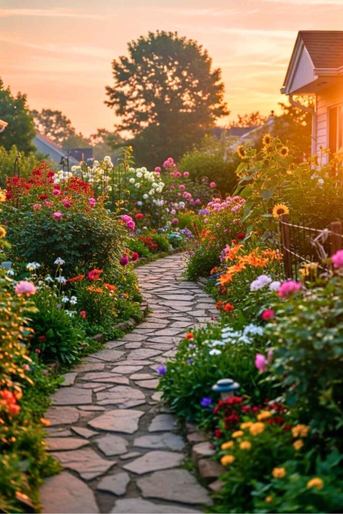 There’s something peaceful about a soft sunrise lighting up a path through wildflowers. Stone slabs wind through a garden bursting with lavender, foxgloves, and daisies.