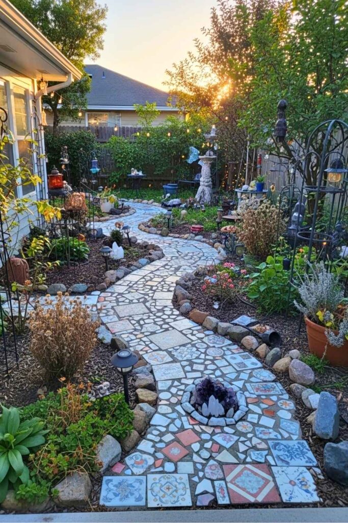 6. Mosaic Garden Path with Eclectic Decor