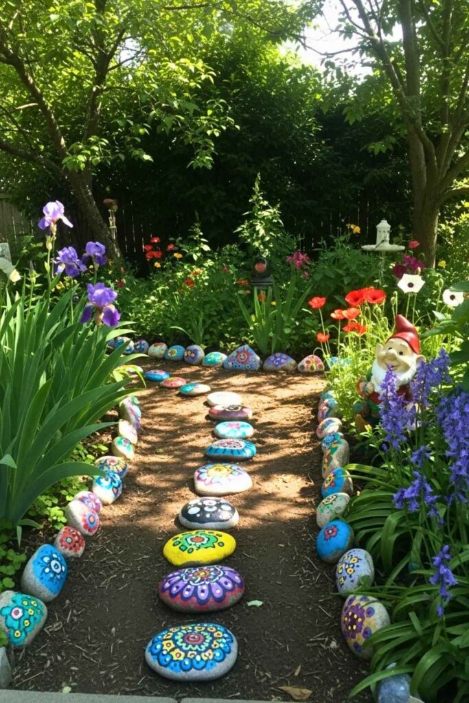 Hand-painted rocks guide the way through your garden with fun symbols or quotes. Each step feels like part of a treasure hunt.