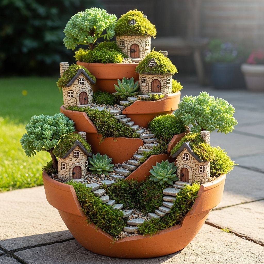 Don’t throw away those cracked terracotta pots! You can stack the broken pieces to create a multi-level terrace for your fairy garden. Use the larger base as the foundation and wedge the shards into the soil to act as retaining walls and tiny staircases. This vertical design allows you to plant different types of succulents and moss at every level, creating a lush, mountainous look. It’s a perfect way to recycle and adds a rustic, aged charm to your garden patio or porch area.