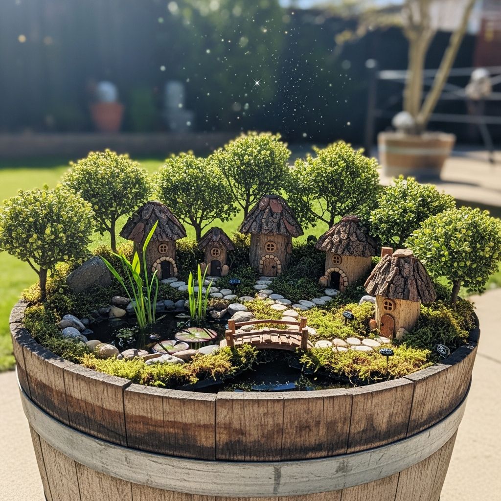 A wooden wine barrel halved horizontally provides a deep and wide space for a complete fairy ecosystem. Because of its size, you can include a small pond using a blue glass bowl, a dense forest made of dwarf conifers, and a tiny village square. Lay down fine gravel for pathways and use larger river rocks to define different zones. The height of the barrel makes it easy to maintain without bending over, and the weathered wood perfectly complements the whimsical theme of the fairy crafts.