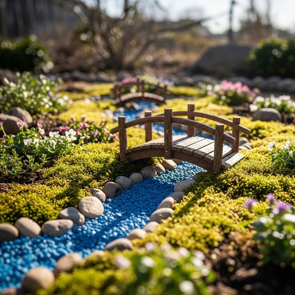 Create a sense of movement in your fairy garden by crafting a dry or wet riverbed. Use small blue glass pebbles to simulate water and line the banks with smooth river stones. You can build a small arched bridge using flexible twigs or popsicle sticks glued together. This craft adds a serene element to your miniature landscape and provides a perfect spot for fairy figurines to ‘relax’. Surround the stream with moisture-loving plants like baby’s tears to enhance the realistic look of a lush riverbank.