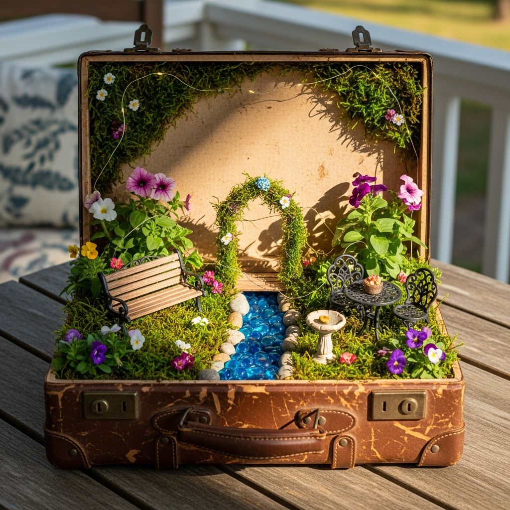 An old, vintage suitcase can be repurposed into a portable secret garden that tells a story of travel and magic. Line the inside with plastic to protect the wood, then fill it with soil and low-growing plants. You can create different ‘rooms’ within the suitcase using tiny fences. One side could be a cozy fairy bedroom with a leaf bed, while the other is a formal garden with a miniature fountain. This is a great conversation piece for an indoor sunroom or a covered porch.