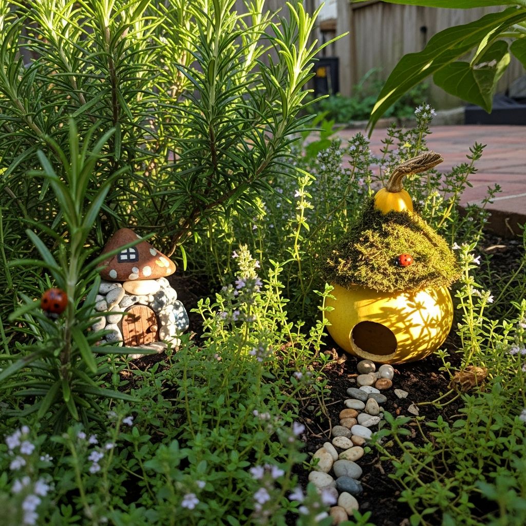 Combine functionality with fantasy by building a fairy hamlet inside your herb garden. Place small fairy dwellings between clusters of rosemary, thyme, and parsley. The herbs act as giant trees and fragrant bushes for the tiny inhabitants. You can even label the herbs with tiny, hand-painted wooden signs that look like fairy road signs. This approach makes harvesting your herbs a magical experience and keeps your kitchen garden looking whimsical and organized throughout the growing season.