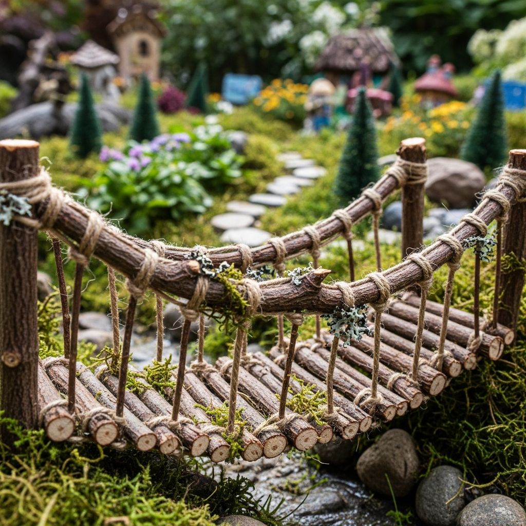 If your fairy garden has multiple levels or large rocks, a suspension bridge is a must-have craft. Use sturdy twigs for the main supports and weave twine or thin rope to create the walkway and railings. It requires a bit of patience but the result is a highly detailed, rustic structure that looks incredibly realistic. Hang it between two large planters or over a dry creek bed to connect different parts of your fairy world. It adds a sense of scale and architectural interest to the display.