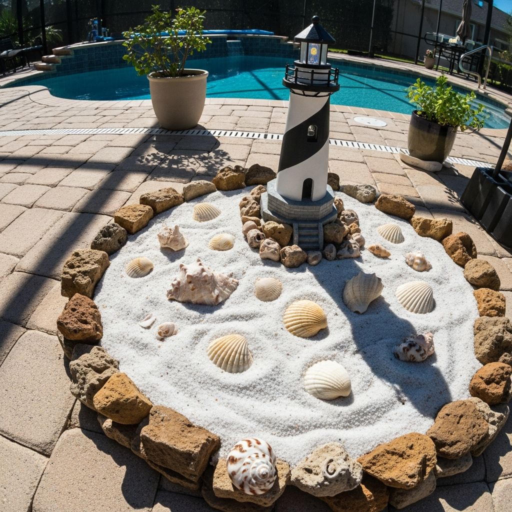 Bring the beach to your garden with a coastal-themed fairy cove. Use white sand instead of soil for the ground cover and decorate with various seashells, sea glass, and driftwood. A small piece of a blue mirror can serve as a calm tide pool. Build a tiny lighthouse out of painted stones and place a miniature Adirondack chair nearby. This theme is refreshing and perfect for summer, offering a bright and airy alternative to the traditional woodland fairy garden style.