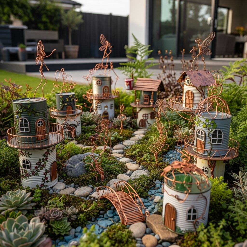 Give your fairy garden an industrial or steampunk twist by using recycled tin cans. Clean the cans and paint them with metallic colors, then use a hammer and nail to punch out window patterns that light can shine through. You can stack them to create ‘skyscrapers’ or turn them on their sides for a modern cabin look. Decorate with old gears, washers, and copper wire. This is a fantastic way to upcycle household waste into a creative and unique garden installation.