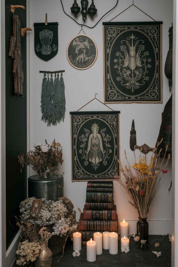 A statement art piece can shift the entire energy of a room. Think botanical illustrations of poisonous plants, vintage tarot cards, astrology charts, or mystical animal sketches. Thrift stores and online shops are treasure troves for this. I even framed a page from an old grimoire once — now it’s the focal point of my entryway.