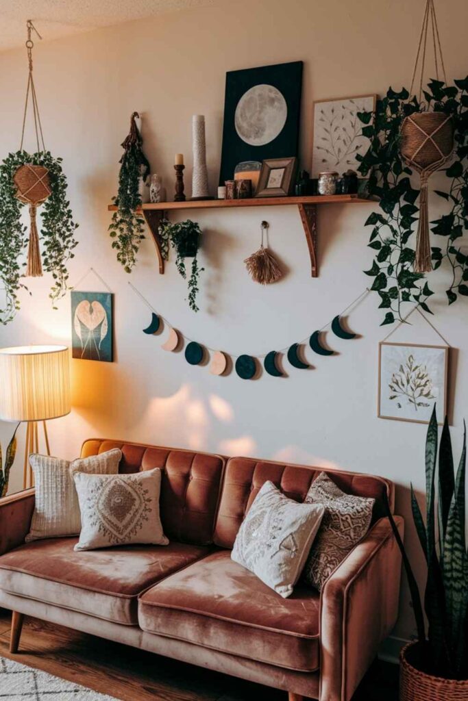 One of the easiest ways to set a magical tone in your apartment is by honoring the moon — she rules cycles, intuition, and feminine power. A moon phase wall display instantly adds witchy charm and reminds you to live in sync with nature. You can find wooden carvings, metal garlands, or even DIY your own with clay or mirrors. Hang it over your bed, altar, or sofa as a celestial focal point. Bonus: light it up with fairy lights for that moody lunar glow.