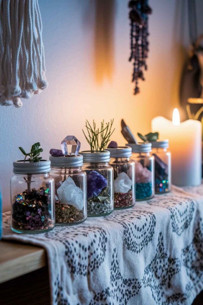 Spell jars aren’t just tools for intention-setting — they’re also stunning decorative pieces. Each one can be created with a specific purpose: love, abundance, protection, or clarity. Fill small glass bottles with layers of herbs, crystals, glitter, essential oils, and even handwritten intentions. Line them up on a shelf or place them on your altar. Over time, they become a personal collection of energy work and mini artworks in themselves.