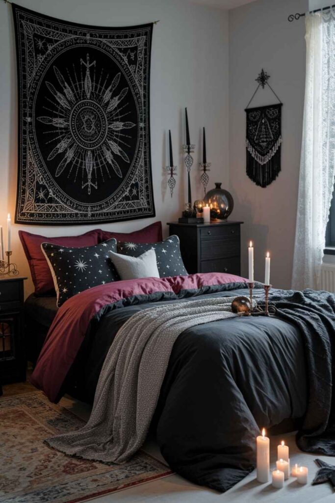 Your bed should feel like a magical cocoon. Choose dark, rich tones — black, burgundy, forest green — and layer different fabrics like linen, faux fur, and velvet. Add a lace throw or celestial-patterned blanket. It’s luxurious, protective, and deeply inviting.