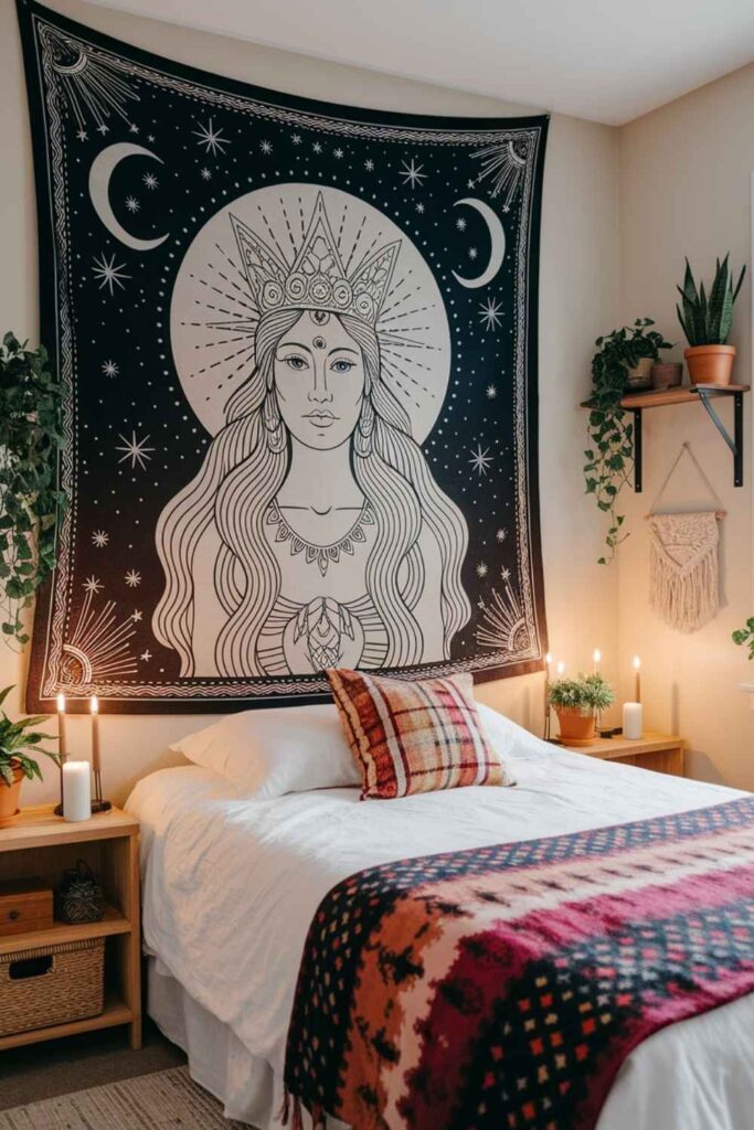 Large tapestries with celestial, astrological, or botanical patterns can define a space instantly. Hang them behind your bed or as wall dividers. I love moon goddess silhouettes or vintage astrology charts in muted, earthy tones.