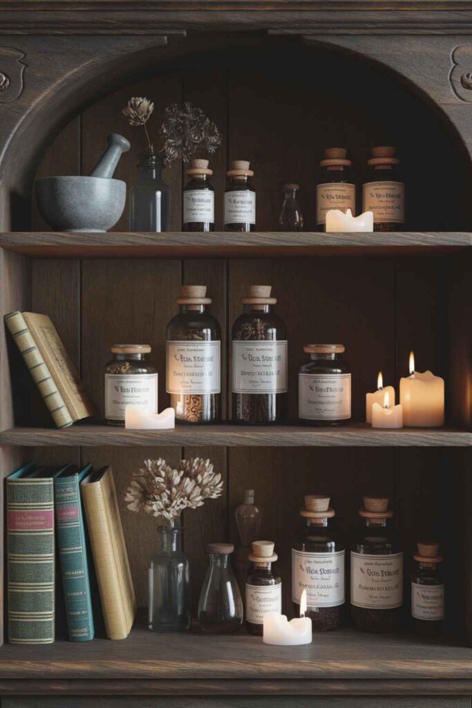There’s something spellbinding about rows of old glass bottles. Fill them with herbs, oils, bath salts, or potion-like mixes and display them on open shelves. Bonus if you use handwritten labels or wax seals — it’s like living in your own apothecary.
