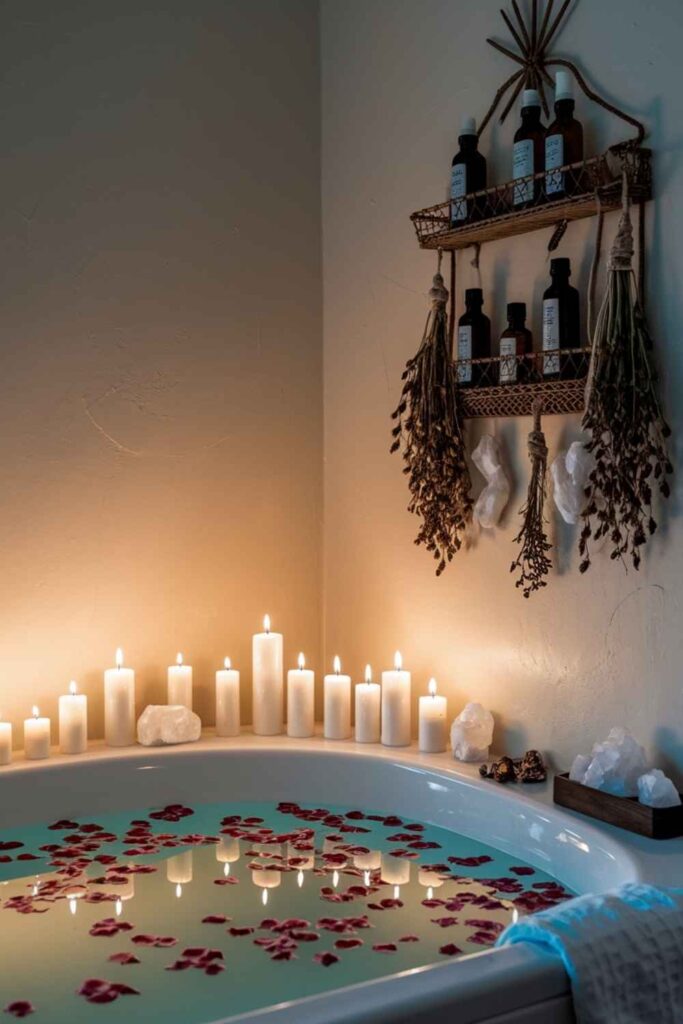 Turn your bath into a ritual with candlelight, essential oils, dried flower petals, and a few strategically placed crystals. I keep a small tray with rose quartz, bath salts, and a tea light beside the tub — it instantly shifts the vibe from “quick shower” to “goddess soak.” Even changing your lighting to something softer makes a huge difference.