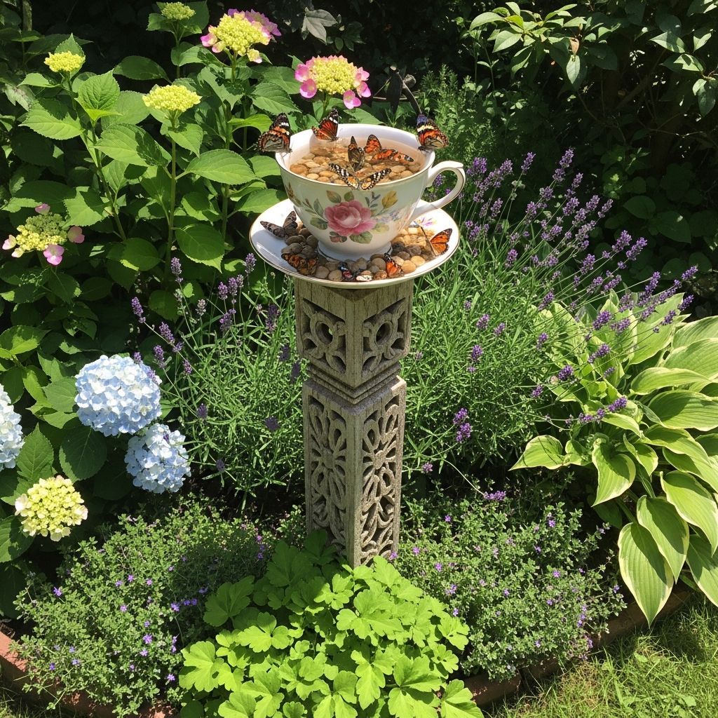 This traditional design uses a shallow terra cotta plant saucer as the base. Fill it with a mixture of coarse sand and a pinch of sea salt to provide the necessary minerals. Arrange smooth river stones on top so that they peek just above the water line, giving butterflies a dry place to land while they drink from the damp sand. It is a timeless look that fits perfectly in any flower bed.