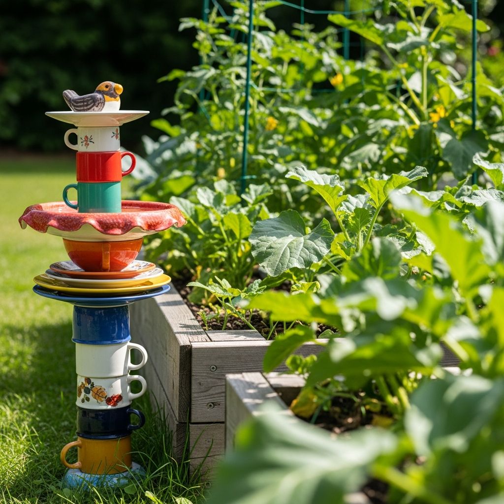 I found a collection of mismatched ceramic mugs and plates at the dollar store and decided to go for an ‘Alice in Wonderland’ vibe. By stacking and gluing them in an asymmetrical tower, I created a playful pedestal. A wide soup bowl on top serves as the bath. It adds a pop of color and a touch of quirkiness to my vegetable garden that always starts a conversation with neighbors.