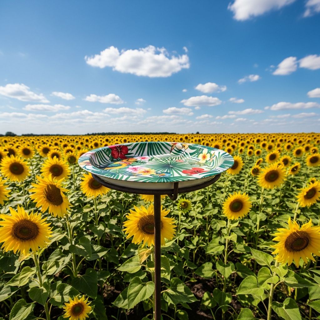 Dollar stores often have these incredibly bright, patterned melamine serving trays. I picked one with a tropical leaf print and mounted it on top of a PVC pipe that I painted to match. It stands tall among my sunflowers, providing a modern and vibrant splash of color. Because melamine is so durable, it holds up perfectly through the summer heat and rain.