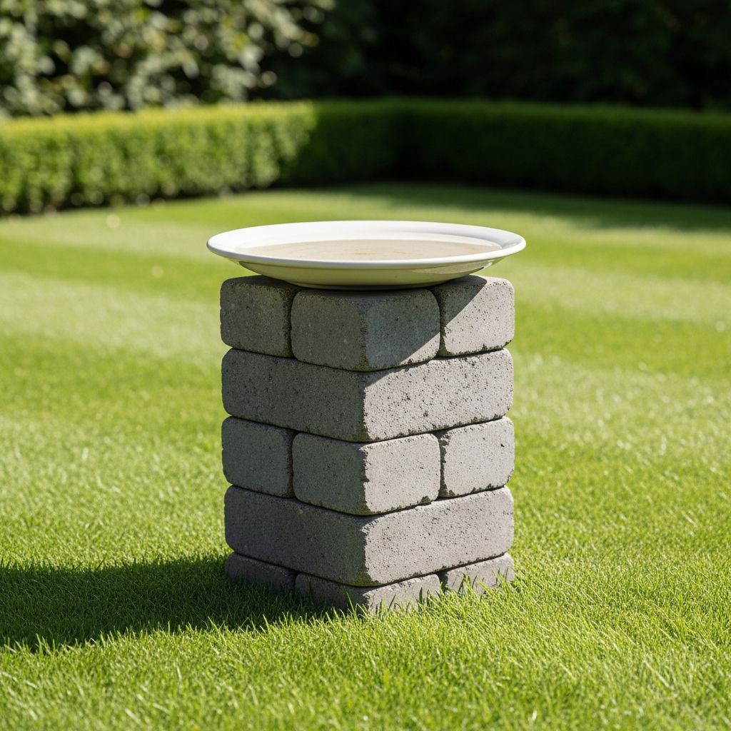 Sometimes the best designs are the simplest. I found some decorative garden bricks and stacked them in a cross-hatch pattern to create a sturdy pillar. I topped it with a large, deep dinner plate in a contrasting color. It has a very architectural, modern feel that fits perfectly with my minimalist landscaping. It took less than five minutes to assemble and cost next to nothing.