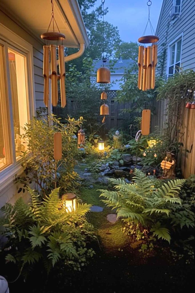 Create a hidden nook with softly chiming wind chimes, bamboo tubes, and small bells arranged to capture the breeze. Choose natural materials that blend with your garden’s energy—this corner becomes a living instrument, whispering the secrets of the wind.