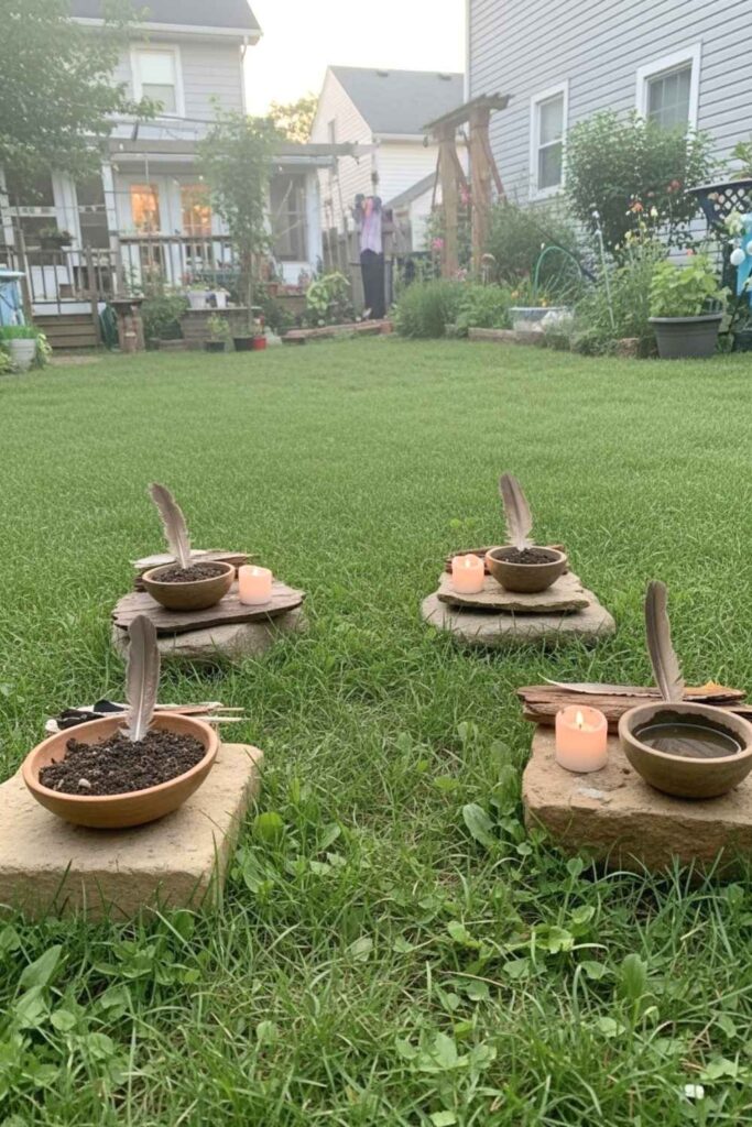 Choose a corner for each element—Earth, Air, Fire, Water. On a stone slab, place a bowl of soil, crystals, feathers, candles, and a water cup. Decorate each with textures and symbols that speak to its element.