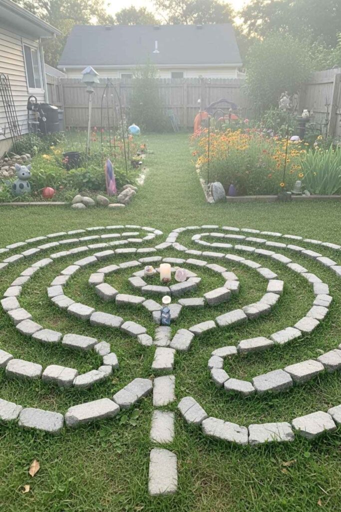 Use stones or flat tiles to create a small labyrinth on the ground—simple spiral or seven-circuit pattern. Walk it mindfully, breathing with each turn. At the center, place a small crystal or candle as a focal point.