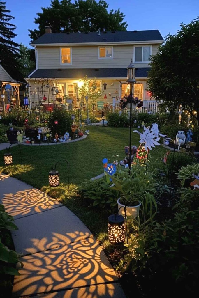 Line a garden path with carved lanterns—use glass jars with botanical silhouettes painted on them. Inside, place solar tealights so that at night, each lantern casts delicate, moving shadows across the path.