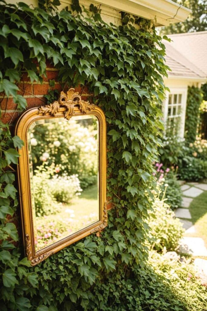 Lean an ornate vintage mirror against a vine-covered trellis or wall. Encourage climbing ivy, jasmine, or clematis to frame it—it becomes a portal reflecting greenery, light, and your own image merging with nature.
