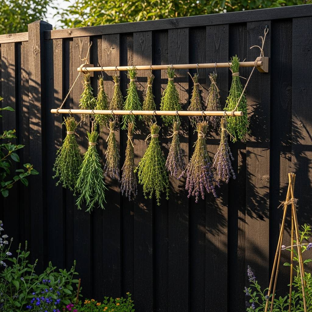 If you are short on ground space, look up! A vertical herb station using reclaimed wood and wrought iron hooks is perfect for drying bundles of sage, rosemary, and lavender. I love how the sight of hanging herbs against a dark-painted wooden fence adds a rustic, functional witchy vibe. It’s not just decorative; it’s a working part of your craft. Adding a small weather-worn wooden table underneath for potting and mixing makes the entire setup look like a professional herbalist’s outdoor workspace.