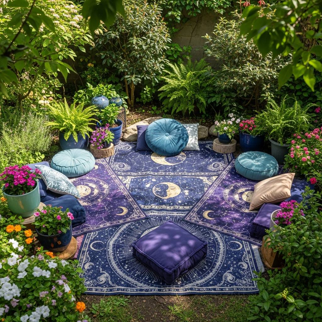 Transform a secluded corner into a sanctuary for divination. I love using a small outdoor rug with a mandala or celestial pattern, topped with weather-resistant velvet floor cushions. Surround the area with tall potted plants like bamboo or palms to create a ‘room’ within the garden. A small stone altar table for your cards and candles completes the look. It’s a functional space that invites you to step away from the digital world and reconnect with your intuition in a lush, green setting.