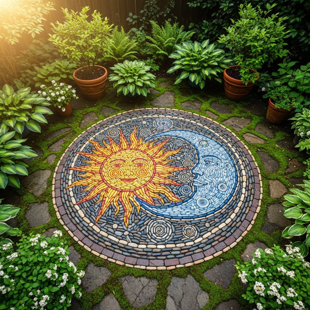 If you have a small patio, consider a stone mosaic featuring sun and moon symbols. Using flat river stones in different shades of grey and tan, you can create a permanent piece of art on the ground. This adds a layer of ‘old world’ magic that feels very authentic. I find that these mosaics look best when they are slightly weathered and surrounded by ground-cover plants like clover or creeping Jenny, making it appear as though the symbols have been there for generations.