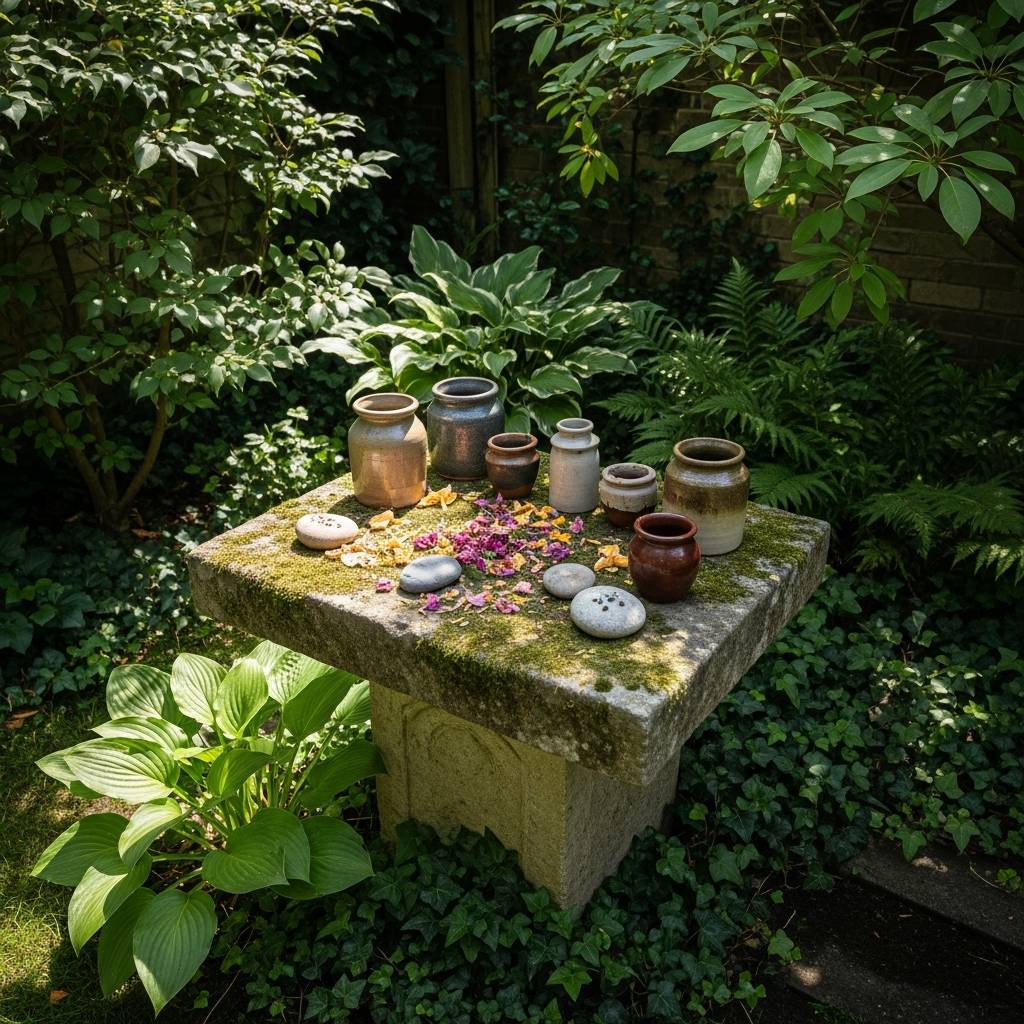 Every witchy garden needs an altar. A simple stone slab or a weather-beaten wooden table can serve this purpose. Decorate it with small bowls for offerings, found objects like bird feathers and bones, and jars of ‘sun water.’ I find that placing the altar under a canopy of overhanging vines or a small tree gives it a sense of protection and secrecy. It’s a place to leave gifts for the local spirits and to set intentions during the changing seasons.