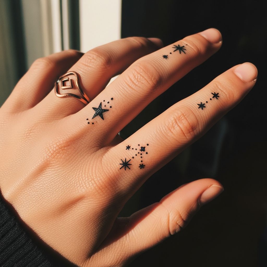 Adding a dash of ‘magic dust’ to your knuckles or the tops of your fingers can make your hands feel truly ethereal. These tiny four-pointed stars or simple dots represent the vastness of the universe. When grouped together, they create a shimmering effect that looks like a constellation. They are one of the best designs for those who want something light and whimsical that complements other pieces of jewelry or larger hand tattoos.