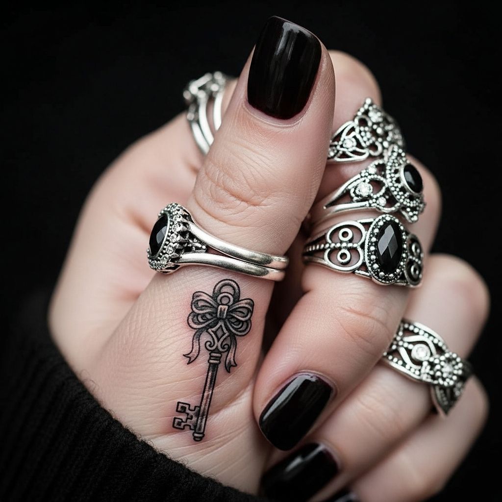 Hecate is the goddess of crossroads, and her key represents the power to unlock hidden wisdom and find new paths. A tiny skeleton key on the thumb or the side of the pinky is a deeply symbolic choice for those undergoing major life transitions. The key should be detailed enough to show its antique character but small enough to remain elegant. It serves as a reminder that you hold the power to open any door in your life.