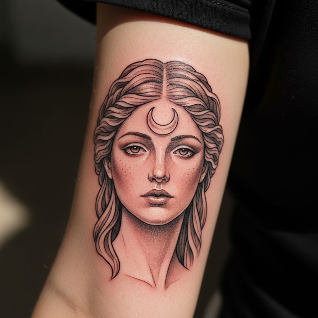 If you feel a deep connection to the lunar cycles, Selene is your goddess. A realistic tattoo of Selene often shows her with a crescent moon crown and ethereal, glowing skin. I love seeing this design with soft, wispy clouds or a starry night background. It’s a beautiful way to represent intuition and the constant ebb and flow of your own emotions. Placement on the inner bicep allows for a vertical, elegant design.