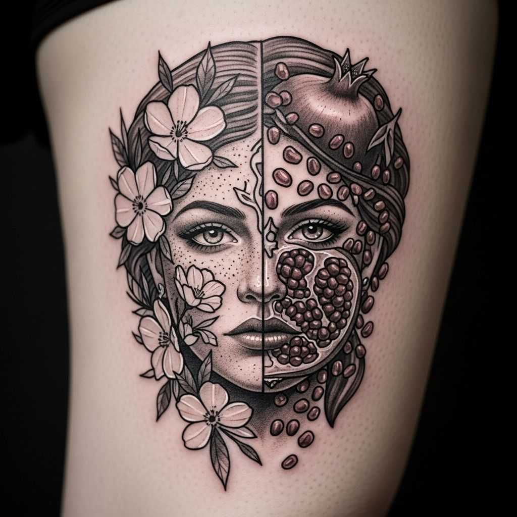 Persephone represents the balance between light and dark. A stunning tattoo idea involves split imagery: one side showing her as the goddess of spring with blooming flowers, and the other as the queen of shadows with pomegranates and skulls. This duality is perfect for someone who has overcome personal shadows to find their own growth. It works wonderfully as a large thigh piece where the intricate floral and dark details can coexist.