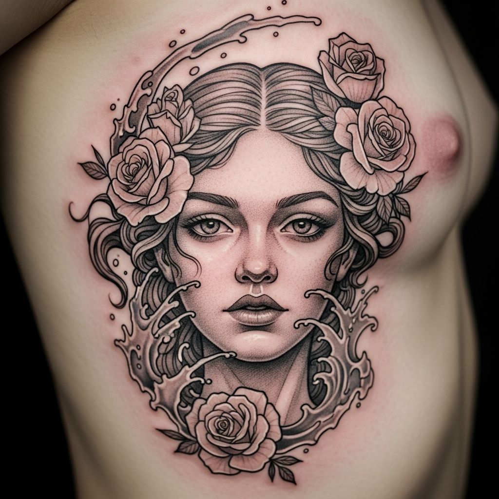 Aphrodite isn’t just about beauty; she’s about the power of self-love and raw desire. A witchy take on Aphrodite might include her emerging from sea foam or surrounded by roses and seashells. The realism in the water droplets and the soft texture of the rose petals can make this piece look like a living painting. Placing this on the ribs or hip creates a very sensual and personal connection to the goddess of love.