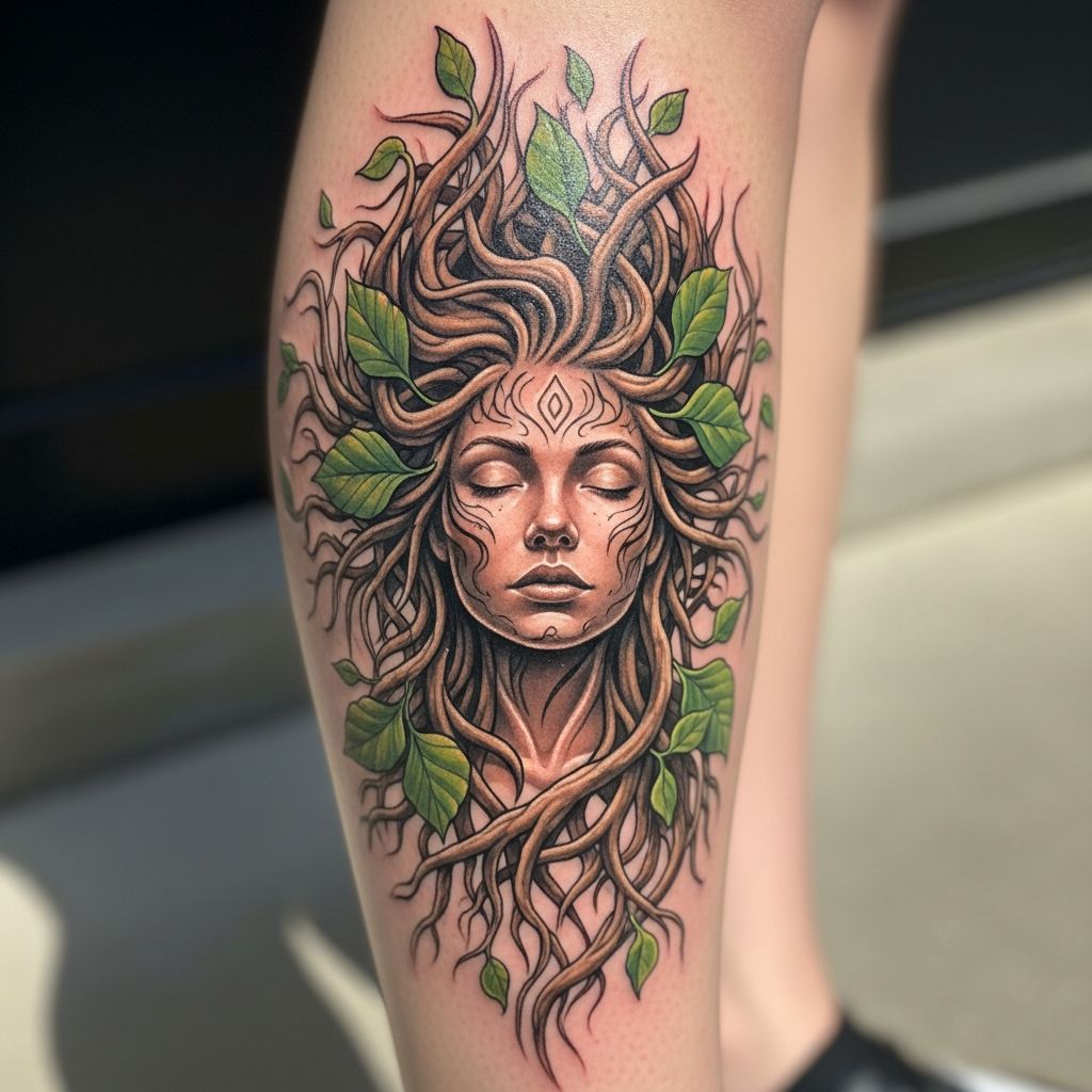 Gaia is the personification of Earth itself. A tattoo of her often uses her body as a landscape, with mountains for bones and rivers for veins. This is a deeply grounding piece of art. I recommend using lots of botanical details—ivy, roots, and ancient trees—to frame her face. This works beautifully as a full-color or black-and-grey piece on the calf or side, symbolizing your connection to the physical world.