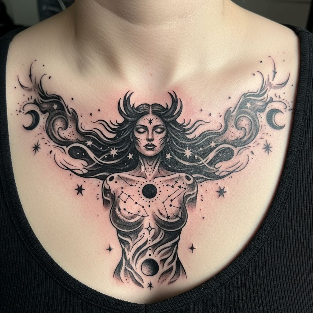 Nyx is the mother of many deities and represents the primordial night. A tattoo of Nyx often uses deep blacks and negative space to create a cosmic effect. Think of a figure draped in stars, holding the darkness like a veil. This is an incredibly sophisticated choice for those who love the mystery of the midnight sky. A chest piece or sternum tattoo allows the ‘veil’ of night to flow naturally with your body’s curves.