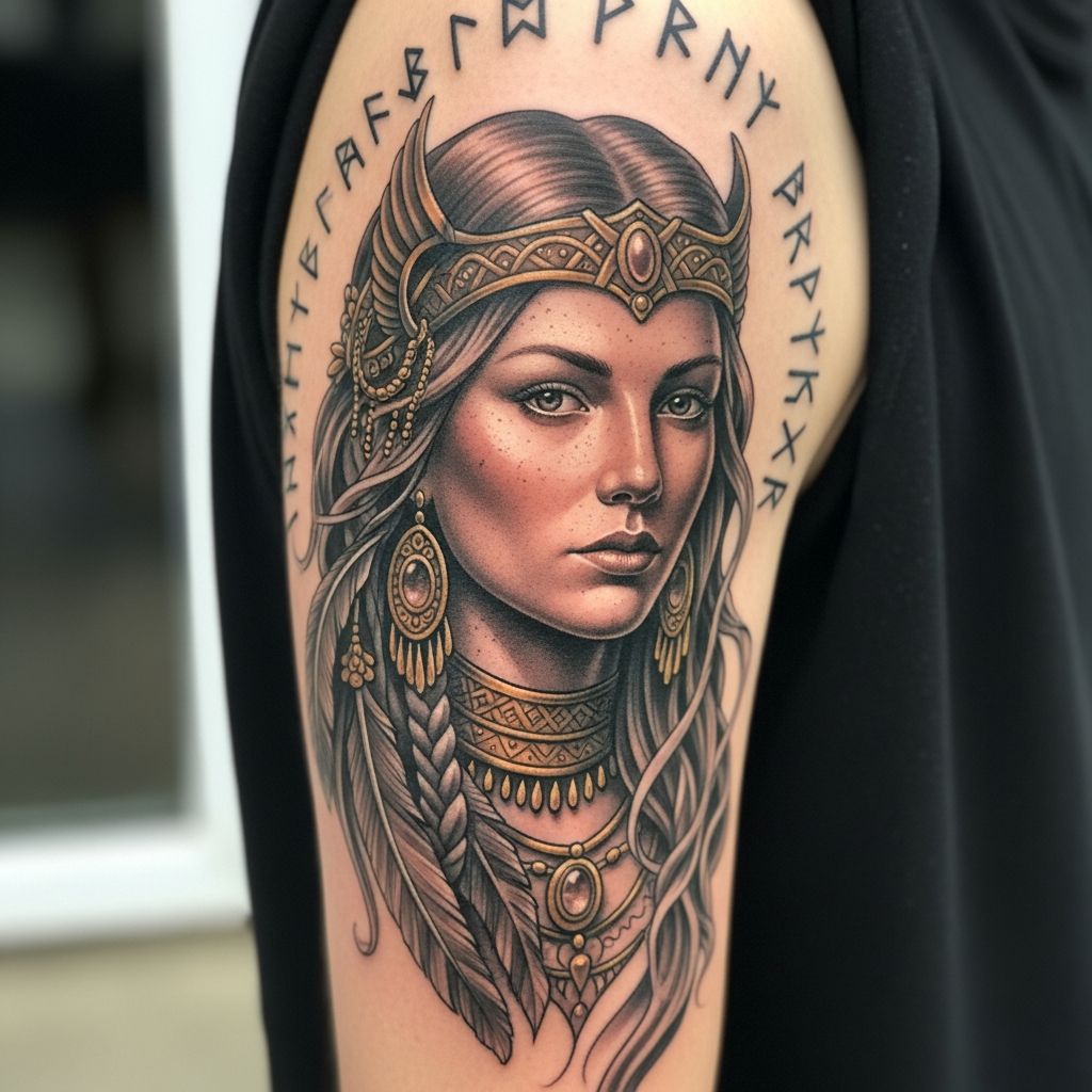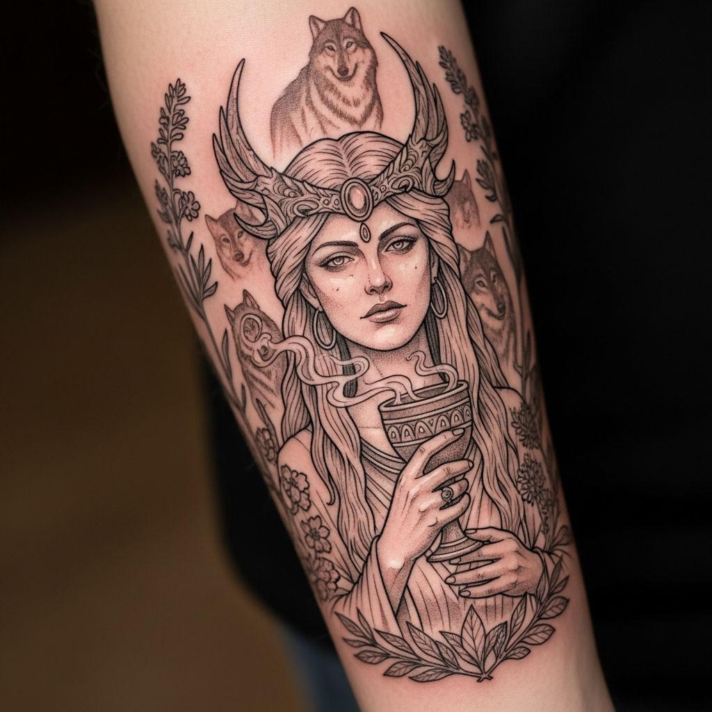 Freya is the Norse goddess of love, beauty, and war, but also of Seiðr magic. Her tattoos often feature her famous necklace, Brísingamen, her cloak of falcon feathers, or her two large cats. It’s a design that screams strength and luxury. Because of the detail in the feathers and jewelry, I suggest a larger placement like the thigh or upper arm to capture all the intricate Norse-inspired patterns.