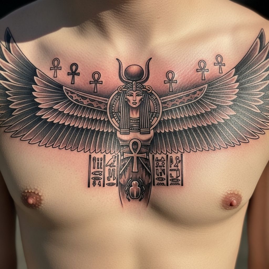 Isis is one of the most powerful goddesses in Egyptian mythology, known for her magical healing and protection. Her tattoos usually feature her iconic wings spread wide in a gesture of protection. Adding ankh symbols or a throne crown can heighten the spiritual significance. This is a classic ‘power’ tattoo that looks breathtaking across the chest or upper back, symbolizing the wings that carry you through life.