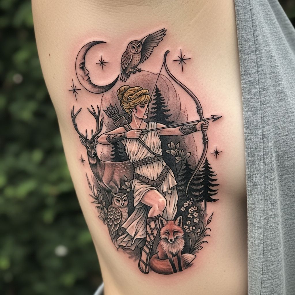For the independent spirit, Artemis is a powerful choice. She is the protector of the wild and the moonlit hunt. A realistic depiction of Artemis usually includes her silver bow, a quiver of arrows, and perhaps a stag or a hunting dog. This tattoo reminds us to stay focused on our goals and protect our boundaries. I think the forearm is the perfect spot for this, making the bow appear as if it’s part of your own arm’s movement.