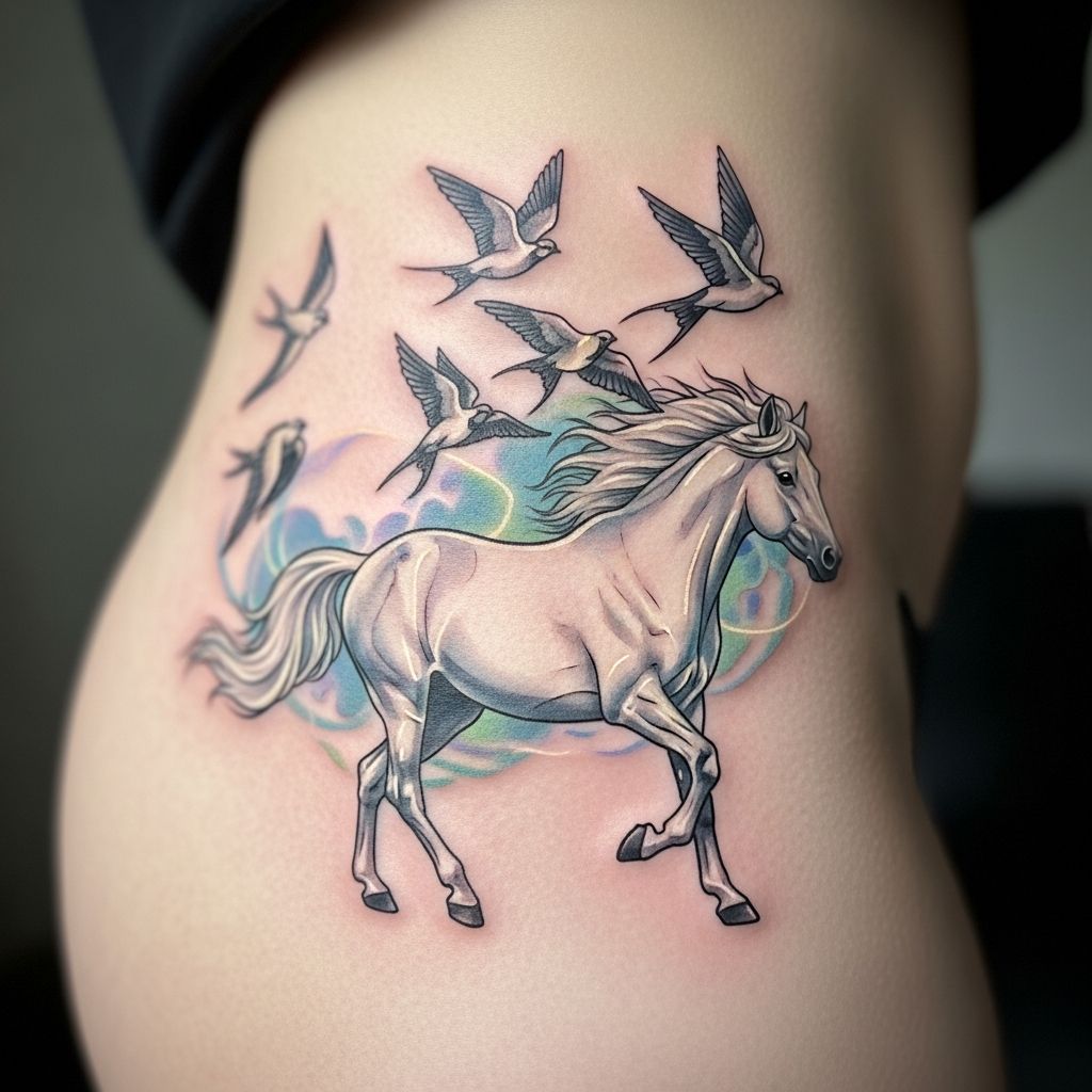 Rhiannon is a Welsh goddess associated with horses, birds, and the ability to endure hardship with grace. A tattoo of her often features her white horse or the three magical birds whose song can wake the dead. This is a very poetic and ethereal tattoo idea. The flowing mane of the horse and the delicate feathers of the birds make this a gorgeous, movement-filled piece for the shoulder or hip.